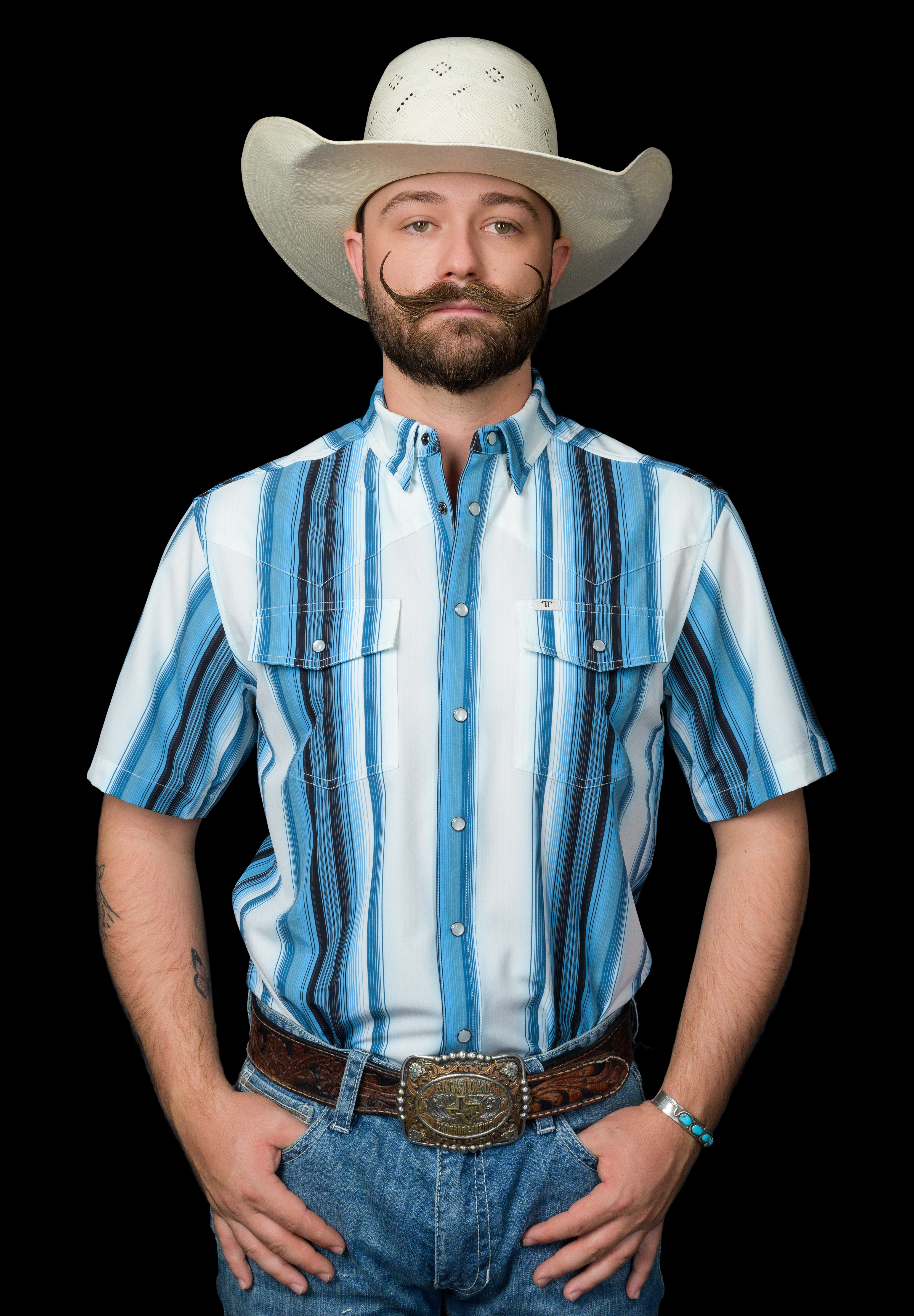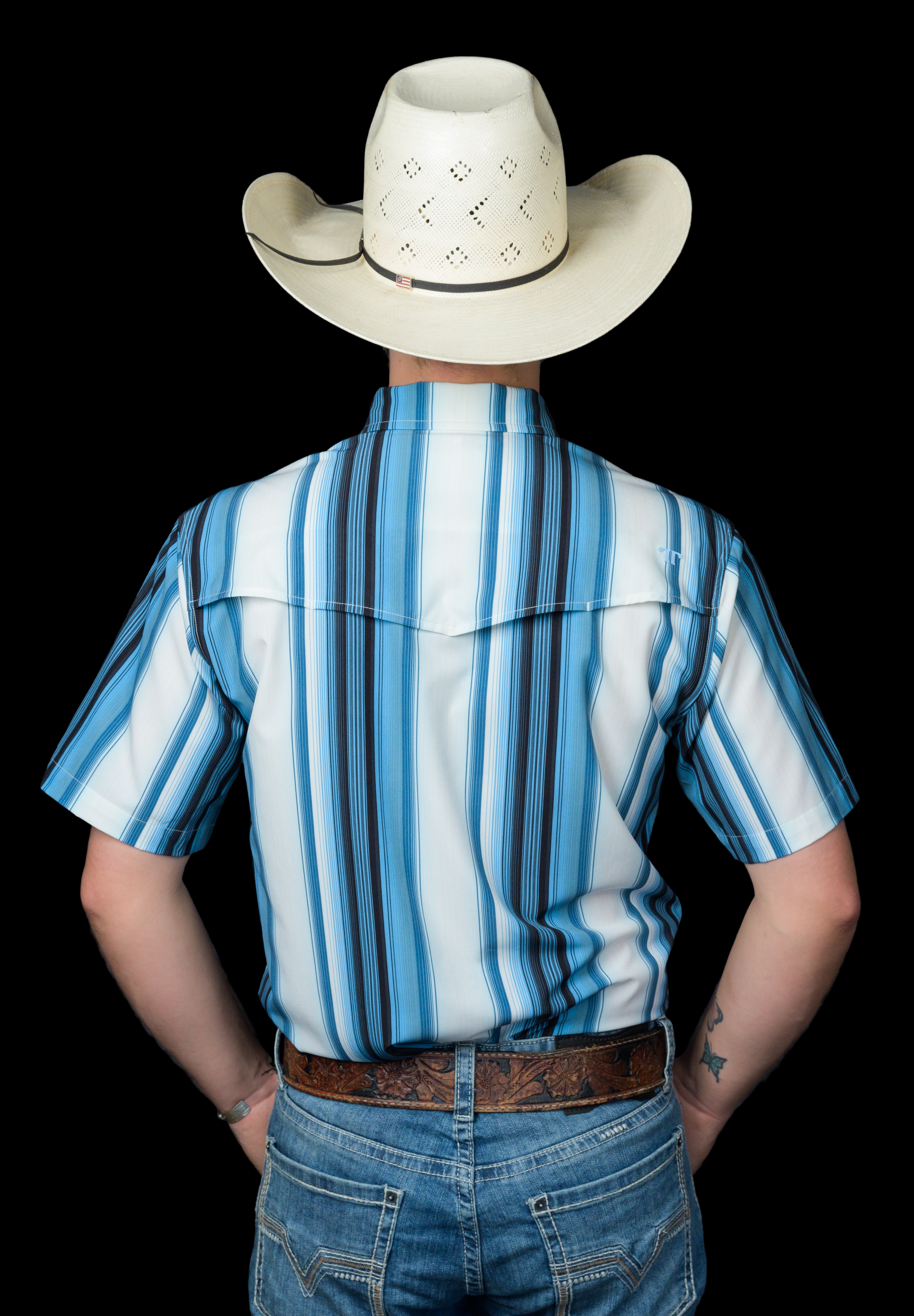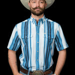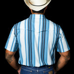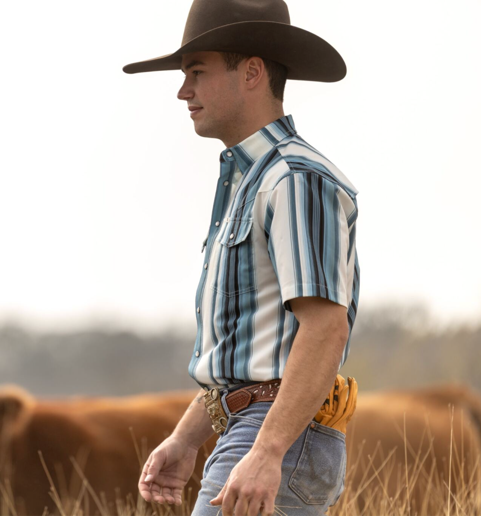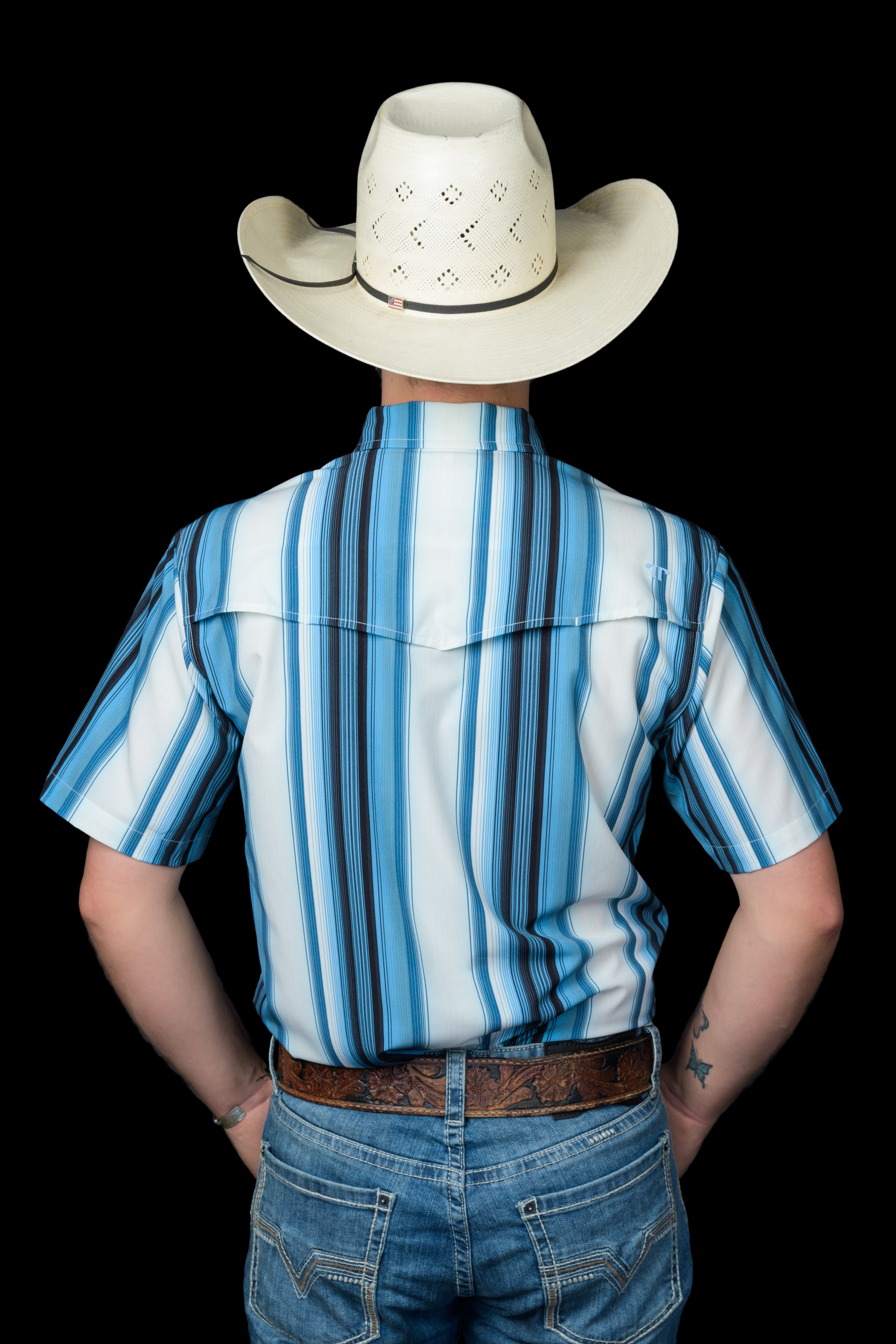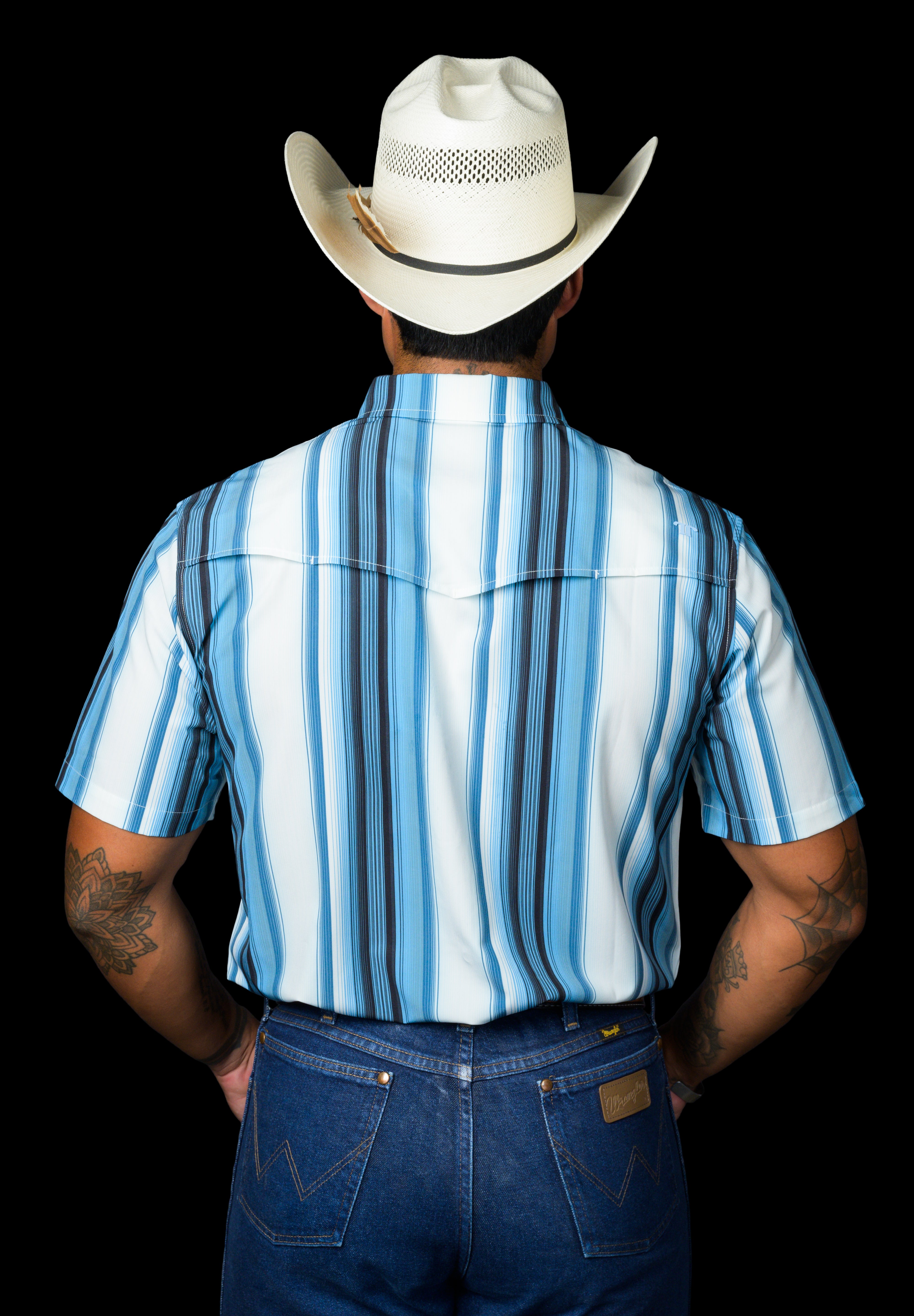 A blue vertical stripe with subtle contrast white and light blue tones, designed for a sharp, traditional western look. Cut in a short-sleeve snap with performance construction, it delivers all-day comfort while keeping a timeless, pulled-together profile.