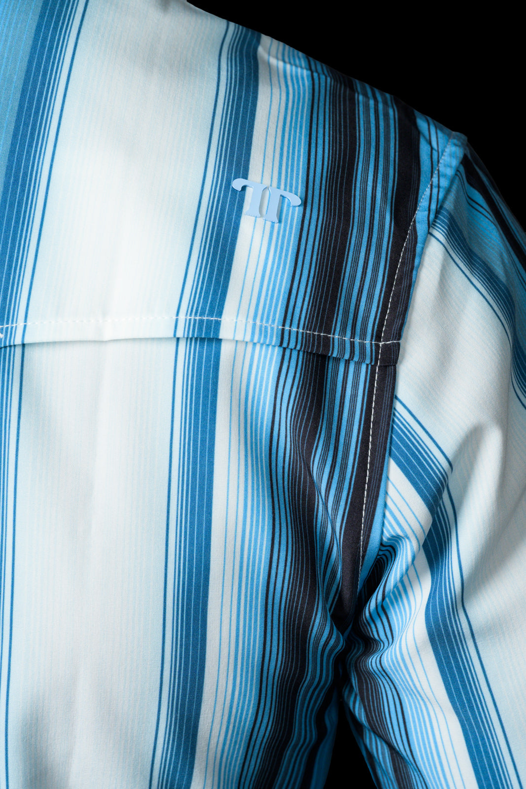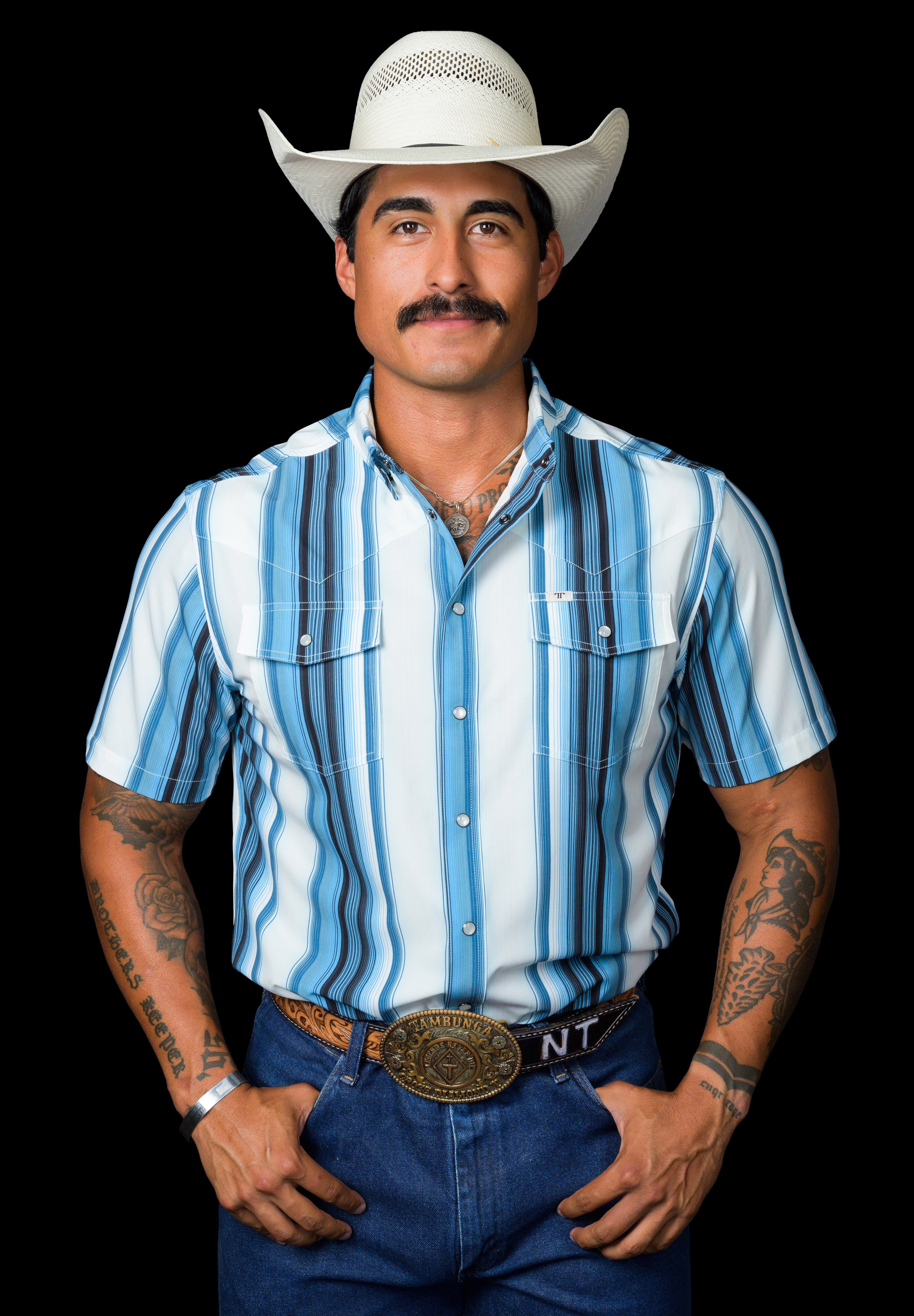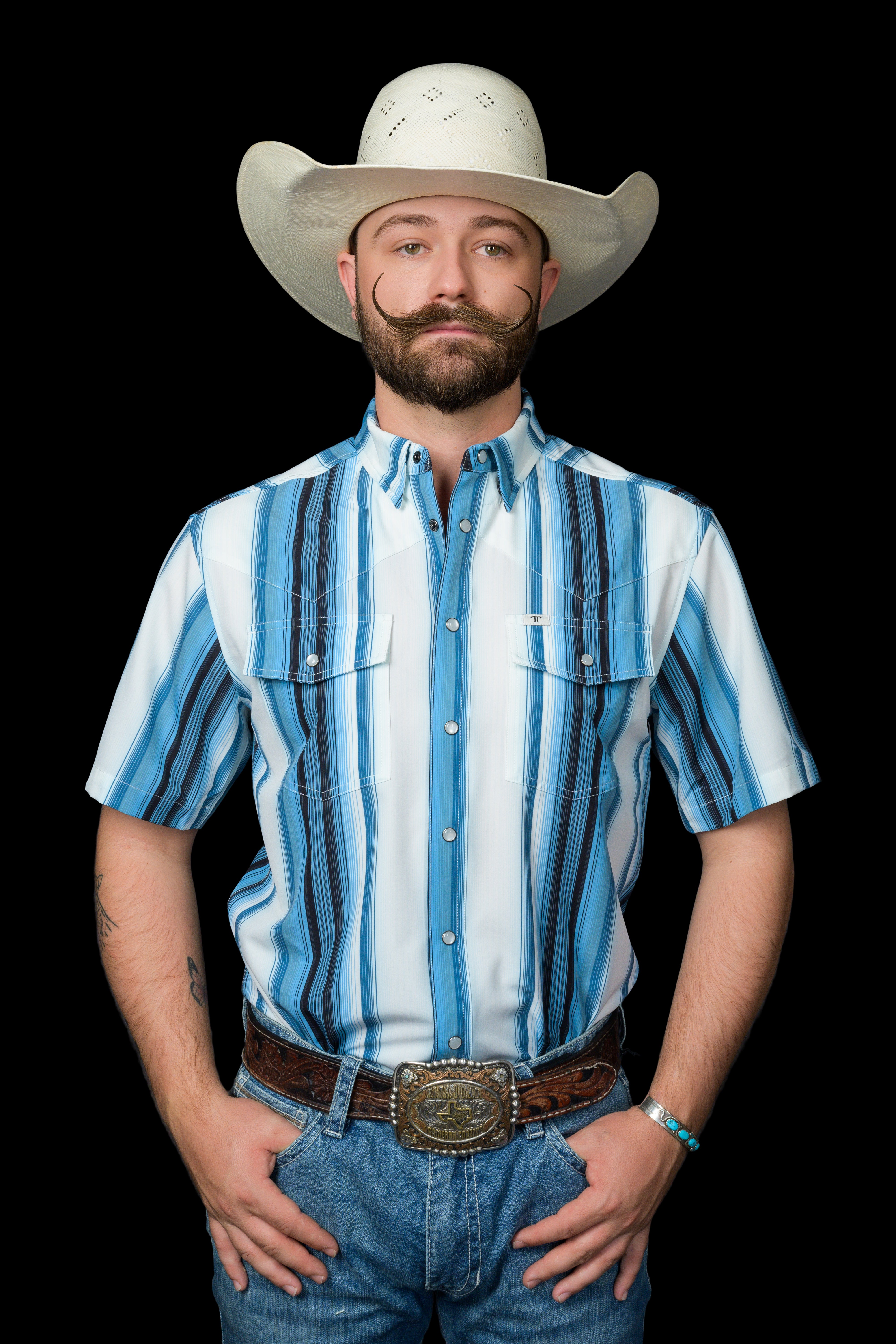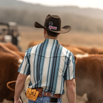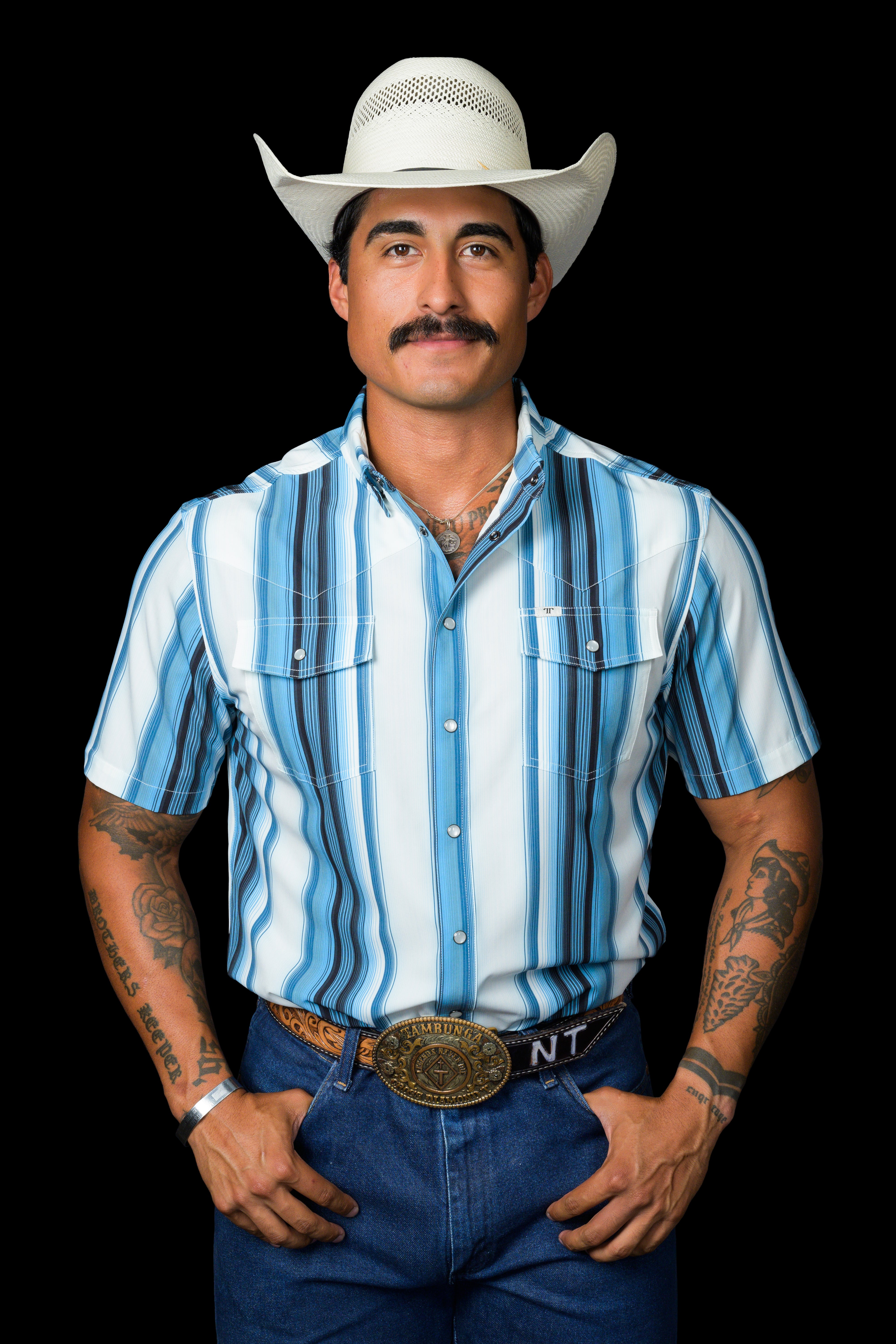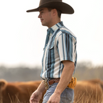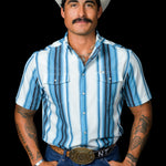 A blue vertical stripe with subtle contrast white and light blue tones, designed for a sharp, traditional western look. Cut in a short-sleeve snap with performance construction, it delivers all-day comfort while keeping a timeless, pulled-together profile.