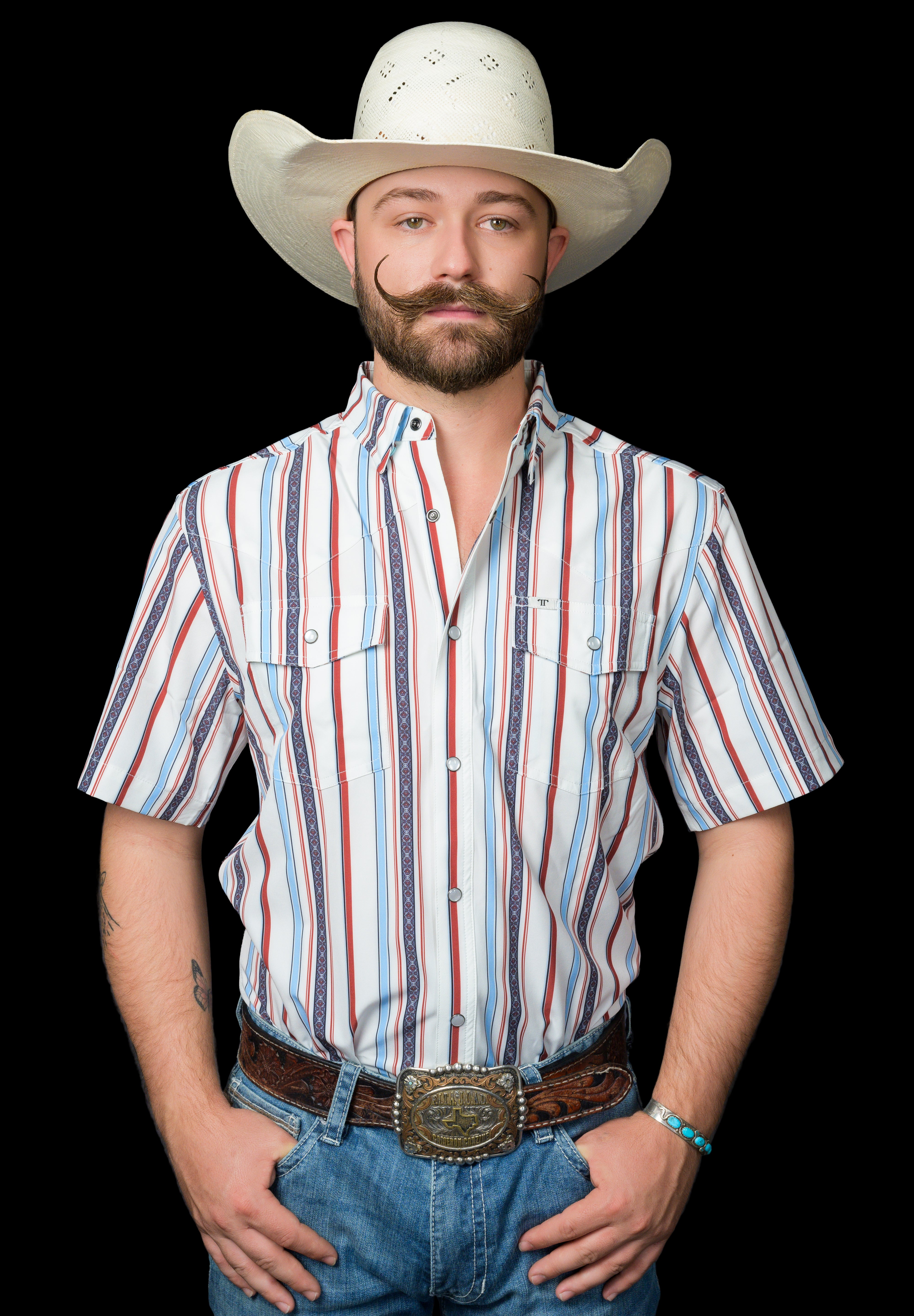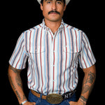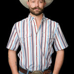 A crisp white base with bold multicolor striping, finished in a short-sleeve snap that feels easy and effortless. Lightweight, breathable, and built with soft stretch, it’s a standout option for hot days when you still want a clean western edge.